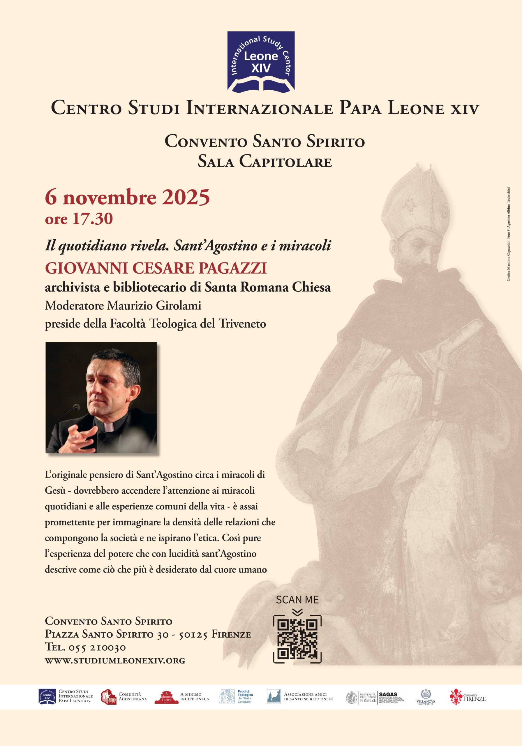 Convento di Santo Spirito Piazza di Santo Spirito, 30, Firenze, ItalyPrima conferenza nell'ambito del primo ciclo di conferenze del Centro Studi Internazionale Papa Leone XIV, dedicato alla figura e al pensiero di Sant’Agostino. Relatore Giovanni Cesasre Ragazzi, archivista e bibliotecario di Santa Romana Chiesa.