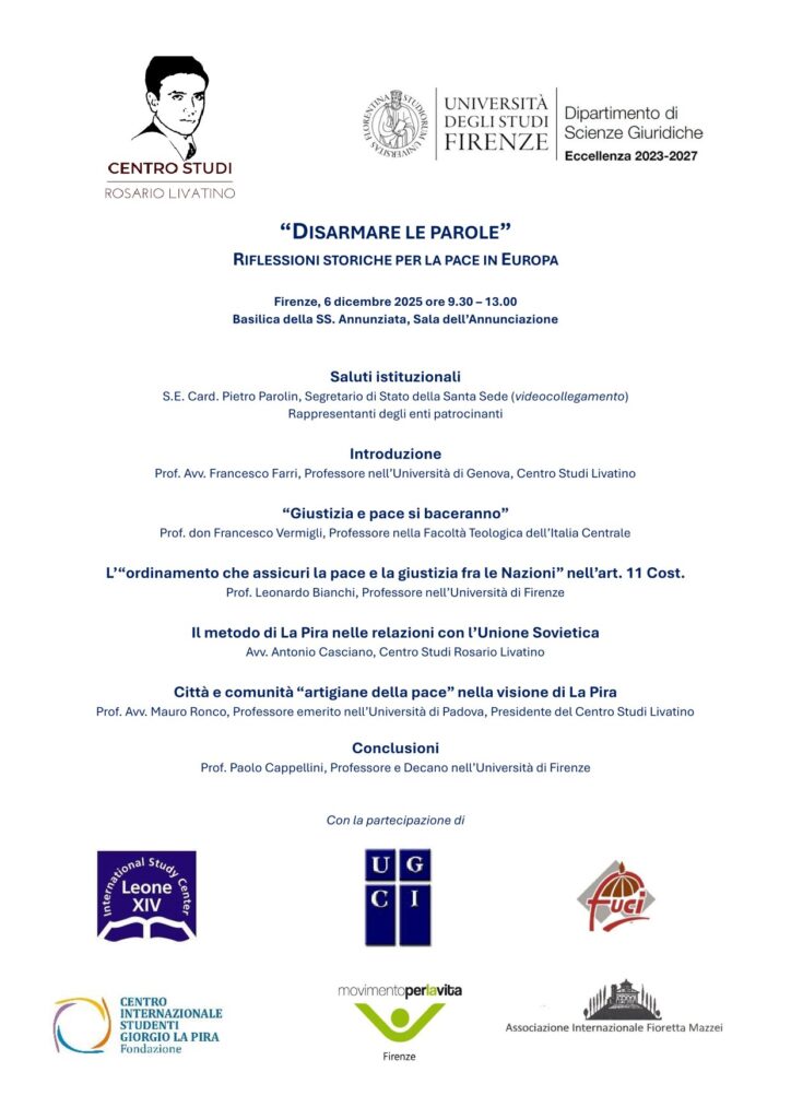 El congreso “Desarmar la paz: Reflexiones históricas para la paz en Europa”, que tendrá lugar el 6 de diciembre de 2025 en la Basílica de la SS. Annunziata de Florencia, nace del llamamiento del Papa León XIV a “desarmar las palabras” y promover una comunicación capaz de construir paz. La iniciativa, organizada por el Centro de Estudios Rosario Livatino y la Universidad de Florencia con la participación del Centro de Estudios León XIV, propone un recorrido ético, jurídico e histórico inspirado en el pensamiento de La Pira y en el artículo 11 de la Constitución italiana, invitando a reflexionar sobre el lenguaje y las relaciones internacionales en una Europa marcada por el conflicto.